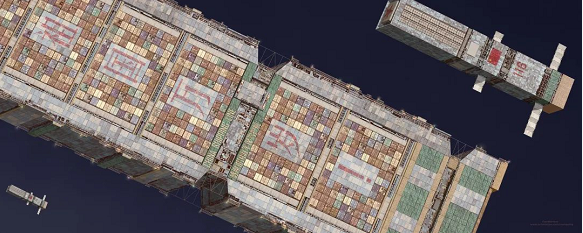 《中国2098》里的国产飞船形态以目前中国的军舰和远洋货轮为参考,它们为了隐身和尽可能多装货,所以有很多“棱角方正”的造型;这些造型和元素经过统一归纳和艺术处理,成为连接虚构未来世界与现实间的纽带,作为“真实感”和“熟悉感”的视觉来源,给人既新奇又亲切的体验。