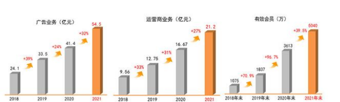 营业收入同比增长9.64%,为153亿元;归属于上市公司股东的净利润同比增长6.66%,为21亿元。其广告业务、运营商业务和有效会员数有保持持续高增长态势,截至年末,其广告业务收入已达54.5亿元,比B站的45.2亿元高,略低于爱奇艺的71亿元。