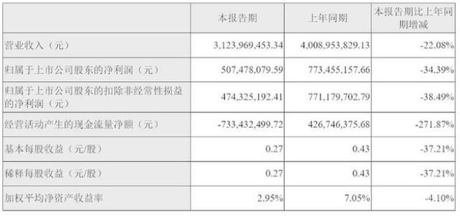 营业收入同比减少22.08%,为31亿元;归属于上市公司股东净利润同比减少34.39%,为5亿元;其现金流量净额更是同比减少了271%。