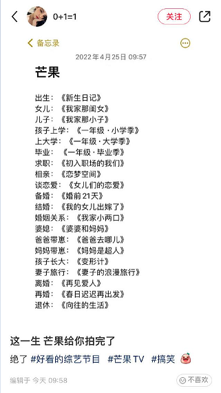 前不久,“芒果台拍完了人的一生”登上微博热搜第一,网友们指出在人生各个阶段,芒果都有对应的综艺,比如出生对应“新生日记”,结婚对应“我的女儿出嫁了”, 离婚也有“再见爱人”。