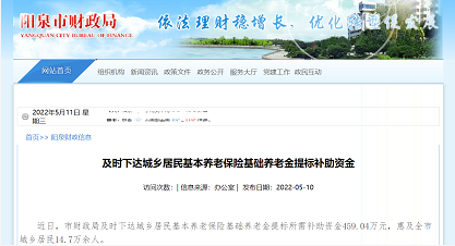 近日,市财政局及时下达城乡居民基本养老保险基础养老金提标所需补助资金459.04万元,惠及全市城乡居民14.7万余人。