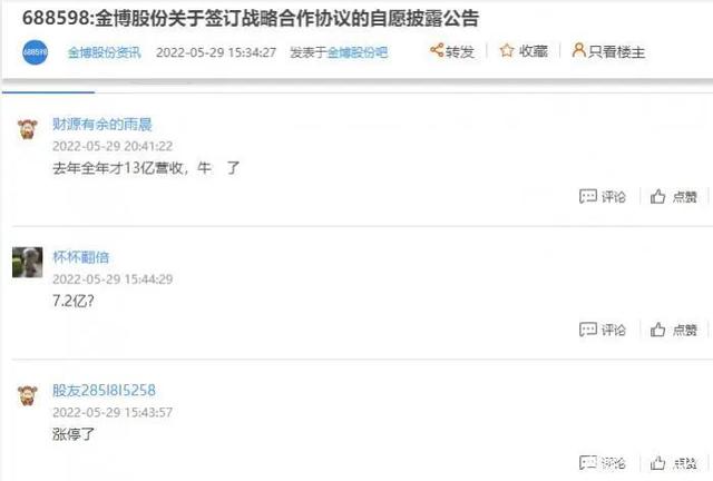 在金博股份股吧里,投资者对于此次合作信心满满,有人直接发表“涨停了”的留言。