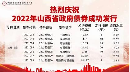 6月20日,记者从山西省财政厅获悉,为充分发挥政府债券稳投资增后劲的重要作用,省财政厅日前成功发行2022年第四批政府债券242.92亿元,其中再融资债券185.84亿元,新增债券57.08亿元,平均利率为2.97%,平均投标倍数20.1倍。