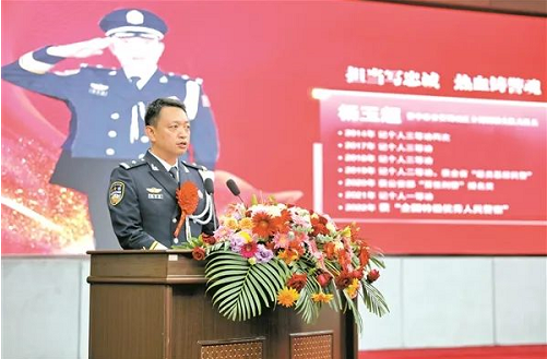 “全国特级优秀人民警察”杨玉超作事迹报告。通讯员 李鹏 摄