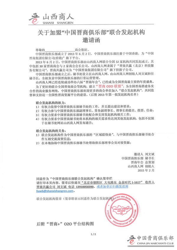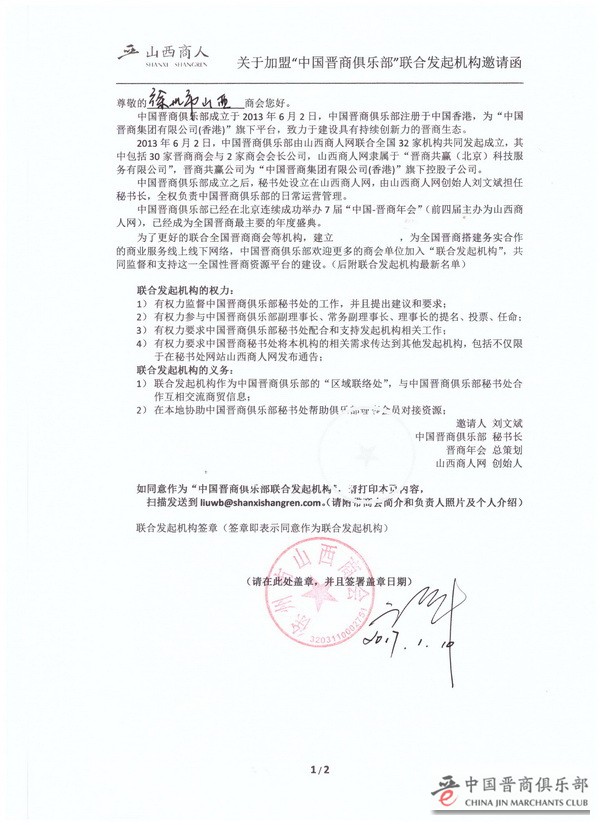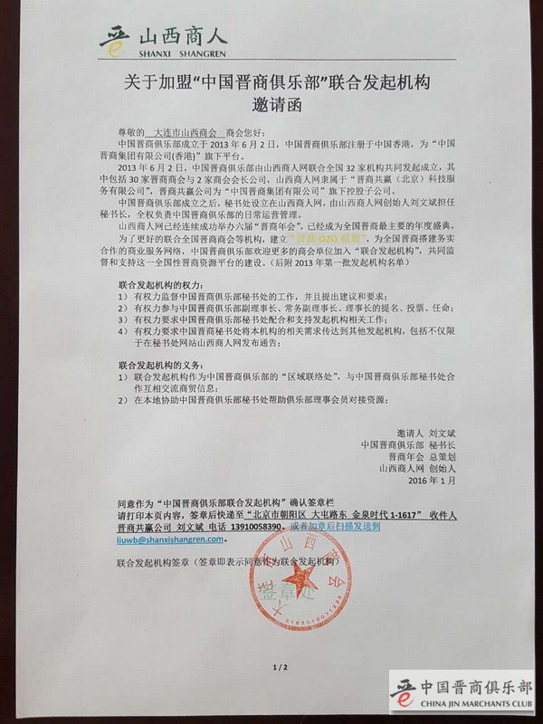 1) 联合发起机构作为晋商俱乐部的“区域联络处”,与晋商俱乐部秘书处合作互相交流商贸信息;