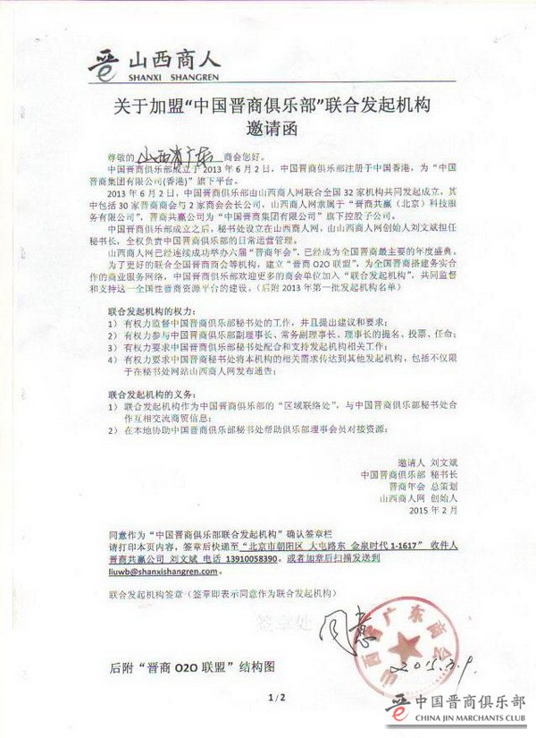 如果您的机构也希望成为中国晋商俱乐部联合发起机构,请与中国晋商俱乐部秘书处联系,电话15300248390,经秘书处确认后签署正式协议。