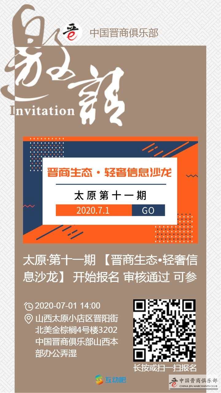 晋商生态 · 轻奢信息沙龙第十一期7月1日周三可报名,欢迎大家的到来。扫描下方二维码即可报名。