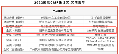 2022国际CMF设计奖获奖作品及奖项授予名单于近日隆重揭晓,箭牌家居ORI系列搓淋按摩花洒荣获产品类金奖(家居),是8个产品类金奖中,唯一一个家居领域的产品,工业设计能力再获国际认可。