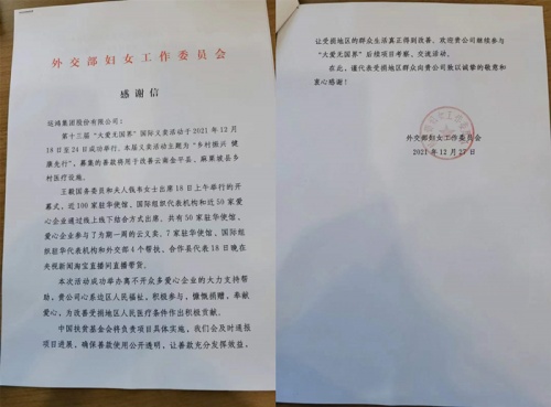 近日,运鸿集团收到了外交部妇女工作委员会授予的荣誉证书与感谢信,这是此前集团参与“大爱无国界——乡村振兴,健康先行”国际义卖活动之后的爱心回馈。该活动有国务委员兼外长王毅和夫人钱韦,外交部党委书记齐玉等外交部部领导,以及160余位外国驻华使馆、国际组织驻华机构、有关企业代表出席,运鸿集团受到了邀请。