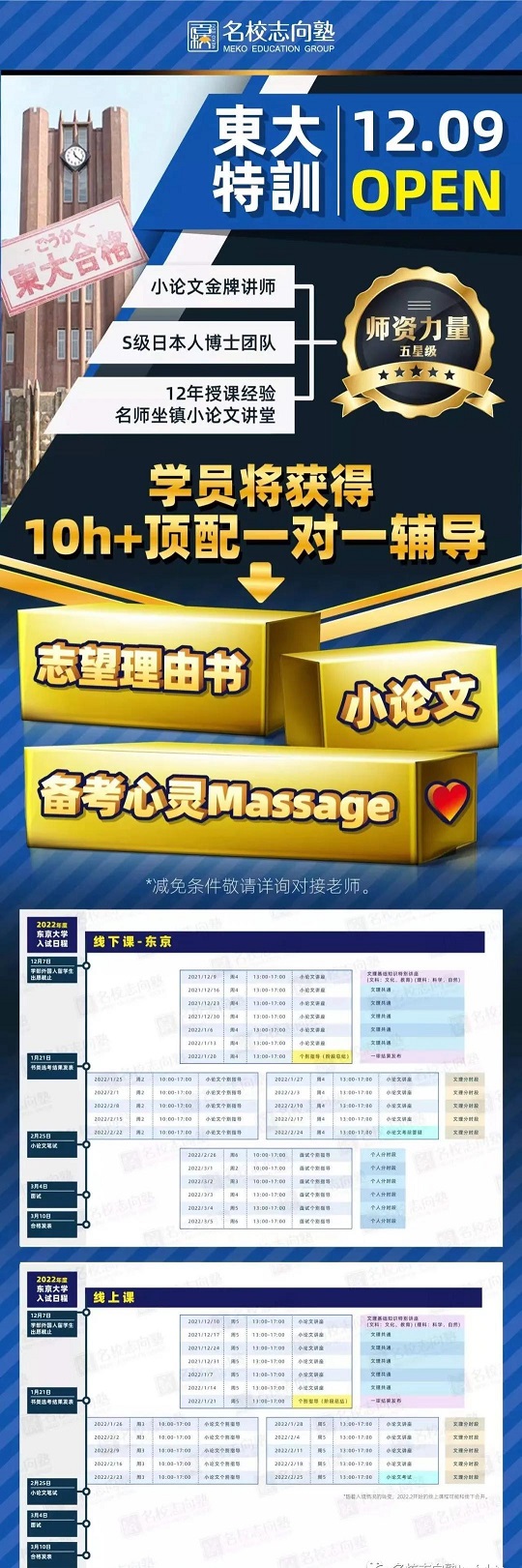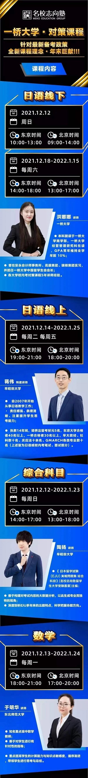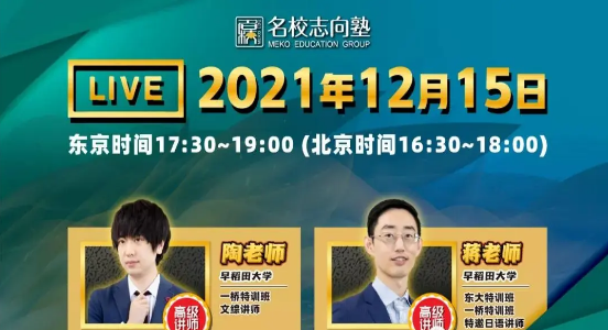 就在2021年12月15日东京时间17:30—19:00,北京时间16:30—18:00,名校志向塾Insights邀请到了两位日本留考及校内考一线导师,为大家打开国内升学日本的全新视野!