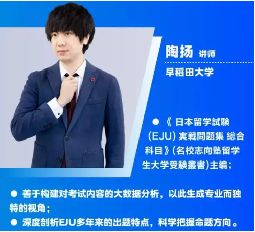 陶老师善于通过对于考试内容的大数据,生成专业而度到的视角,来深度刨析EJU多年来的出题特点,科学把握命题方向。