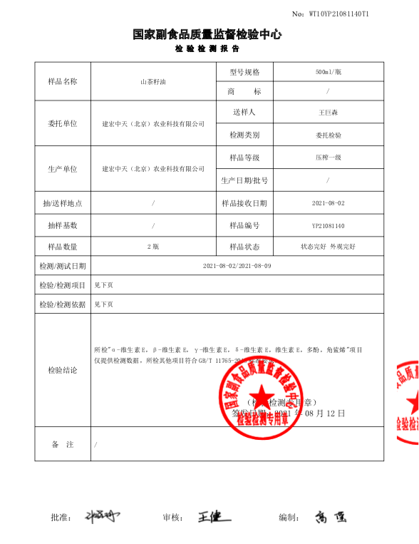 光山县建宏中天农林发展有限公司是一家集研发、生产、销售于一体的山茶油制造企业。公司坐落于河南省光山县,这里的林地资源丰富气候适宜,油茶种植总面积高达25.5万亩,秉持“扎根山区、培植油茶、绿色发展、长效富民”的发展理念,光山县建宏中天农林发展有限公司依托技术创新,与中国林科院亚林所开展合作,同时聘请老师前来种植指导,种植出来的油茶不仅色泽鲜艳亮丽而且油脂也非常丰富,将油茶的品质成功推向了一个新的发展高度。茶油的不饱和脂肪酸高达百分之九十,油酸含量高达百分之七十四以上,亚麻酸含量高达百分之一点七,因此它被称为“月子油”、“益寿油”,因此,茶油也得到了世界粮油组织的强烈认可。