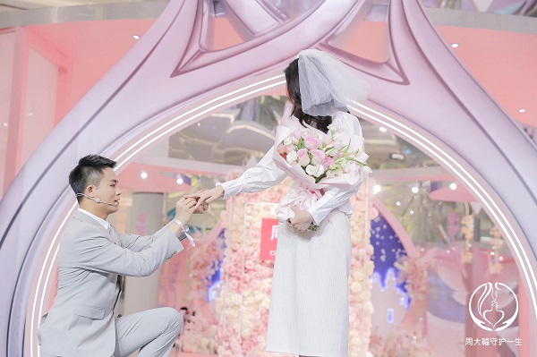 发布会现场更变为暗藏惊喜的大型求婚Party,周大福珠宝集团董事总经理陈世昌先生为三周年新品揭开神秘面纱,同时周大福珠宝集团代言人李冰冰作为用心守护爱的见证者送上祝福,见证用心形「守护一生」钻戒“承一生之诺、倾一生守护”的浪漫求婚瞬间。