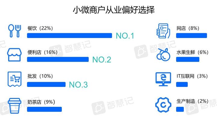 形式多元化:以夫妻老婆店 、家庭式作坊、线上网店、线下门店等多种形式出现;从事行业遍布便利店、餐饮、生鲜、服装等各个行业。