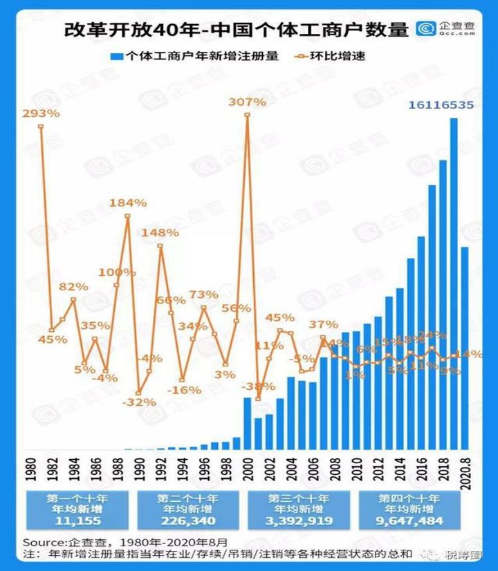 据统计,截至2020年8月,企查查数据显示,我国在业/存续个体工商户共计8920万。市场监管总局数据显示,中国个体从业人数目前已超过1.76亿,相当于每8个中国人就有1个是个体户。