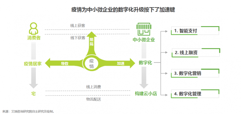 疫情期间消费者长期宅在家,转而通过线上渠道进行消费,绝大部分小微企业因为没有线上营销系统,线下的获客渠道被阻隔只能关店,而那些有营销系统的商家生意照样线上做。在2020年5月份,为帮助中小微企业快速摆脱疫情困扰,国家发展改革委、中央网信办联合印发《关于推进“上云用数赋智”行动 培育新经济发展实施方案》,启动面向中小微企业数字化转型发展的“数字伙伴行动计划”,推出了面向中小微企业的500+服务举措,加速中小微企业数字化转型的脚步。