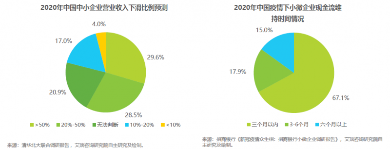 招商银行小微企业调研报告指出接近1/4的小微企业表示受疫情严重冲击,经营已陷入困境(16.9%),甚至面临倒闭风险(5.8%)。67.1%的小微企业预计现全流无法维持三个月以上,只有15%的小微企业现金流可以维持6个月以上。清华、北大联合调研995家中小企业报告指出,29.6%的中小企业2020年营业收入下降幅度将超过50%,58.0%中小企业营业收入下降20%以上;只有4%的中小企业认为营业收入下降幅度小于10%。