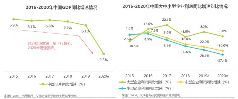 受疫情影响,世界银行最新报告预计2020 年中国GDP同比增速大幅度下滑至 2.3%。宏观经济下行周期中,大型企业利润受到冲击较小,而小微企业的行业类别多为批发零售业、餐饮、租赁和商户服务等行业,而这次疫情中,这些企业由于自身抗风险能力偏低、融资困难等问题,相较于大型企业,企业利润同比增速降为负值,并不断加速下降。