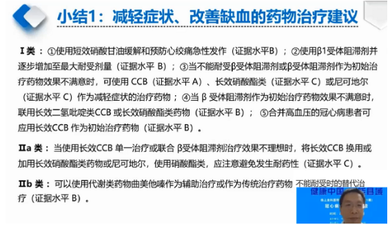 在用药分类方面,李刚教授介绍,冠心病的用药主要分为两类。第一类是改善缺血、减轻症状的药物;主要包括β受体阻滞剂、硝酸酯类药物及钙通道阻滞剂。《冠心病合理用药指南(第2版)》对该类药物的治疗建议为: