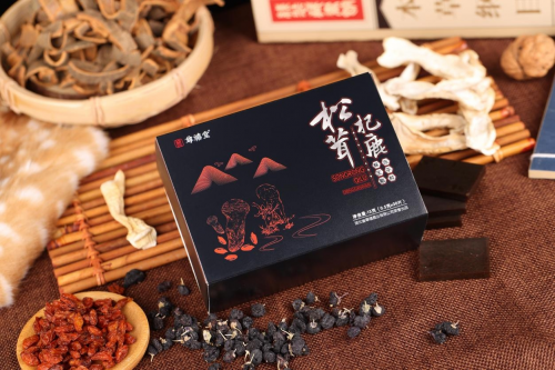 尊禧堂松茸杞鹿冻干片,从医书典籍《神农本草经》、《药鉴》、《本草汇言》等多部中医经典中汲取灵感,融入现代科技低温冻干技术,用隐喻梅花鹿神秘感的黑色包装,营造满满的传统滋补氛围。