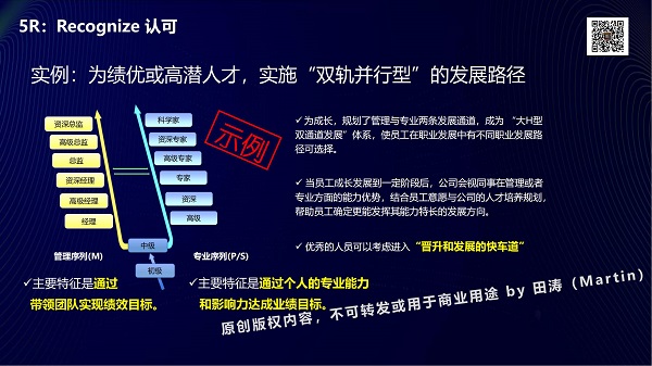 在非物质认可的实施中,我们对于绩优/高潜的人才应用的是双轨策略:他可以选择M序列(管理序列)来发展,也可以选择P序列(专家序列)来发展。