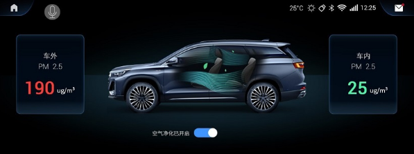 需要注意的是,PM2.5大小不足头发丝直径的1/20,是肉眼不可见的可吸入颗粒物,为了让用户有更直观的感受,捷途X90子龙搭载了双通道激光PM2.5传感器,可实时监测车内外PM2.5浓度,并将数据直观地呈现在中控大屏上,让清新空气“看得见”。当车内空气质量变差时,捷途X90子龙会自动启动空气净化系统,并智能调节空调风量大小,提升车内空气净化效率,无论用户是否开窗换气,都能纵享清新空气。
