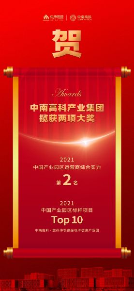 2021年9月15日,产城观察网携手亿翰智库在上海举办第五届中国产业园区运营商百强峰会,中南高科产业集团以专业的服务能力和稳健的经营业绩,获得2021中国产业园区运营商综合实力第2名。中南高科旗下的惠州仲恺高端电子信息产业园获2021中国产业园区标杆项目TOP10。