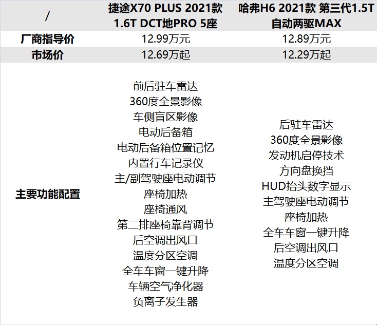 上表可见,两款车在配置上就同级来说都属于非常齐全的,像座椅加热、全车车窗一键升降、温度分区空调等等一应俱全,但总体上风格上还是有所不同。第三代哈弗H6配有在家用SUV上很少见的HUD抬头数字显示和方向盘换挡拨片,而捷途X70 PLUS不仅前后都有驻车雷达,还内置了行车记录仪,像座椅通风、空气净化器和负离子发生器等配置也一应俱全,相较第三代哈弗H6要更具诚意,也要更注重实用性。