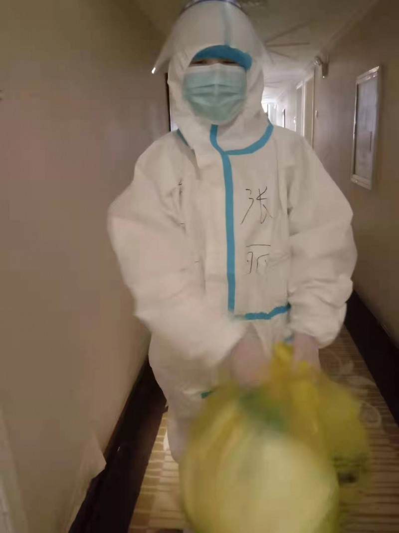 在支援的这些天里,“不怕苦不怕累”是她的基本素养,“没事,我去”成了她最常说的话,勇于担苦、担难、担险、担重,从未抱怨过一个人承担三个人的工作量之大,没有一次想退缩,全程参与了24小时的隔离运作。