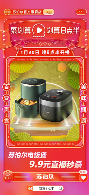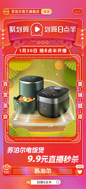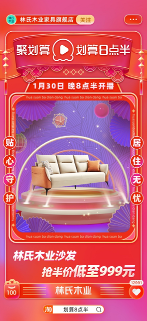 在1月30日当晚20:30,聚划算将通过《划算8点半》直播,联合林氏木业家具旗舰店、苏泊尔官方旗舰店、金领冠官方旗舰店、立白集团官方旗舰店、海尔官方旗舰店等品牌旗舰店,为消费者奉上精彩超值的商品直播!