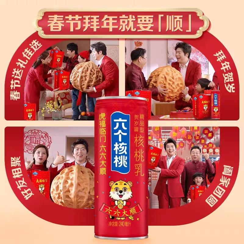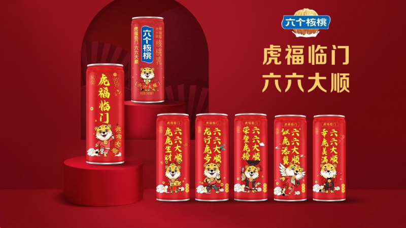 六个核桃虎年贺岁罐,以喜庆中国红为主色调,以金色毛笔字体装饰,配以现代化的卡通虎的形象,中国元素满满,并用“吉祥话”为文案,巧妙表达出对大家“虎福临门—六六大顺”美好祝福。其中每个罐体分别表达了对不同群体新年祝福:事业虎,祝您似虎添翼;爱情虎,祝您幸虎美满;财富虎,祝您虎虎生财;学业虎,祝您荣登虎榜;健康虎,祝您龙行虎步。春节拜年就要“顺”,六个核桃用虎福临门,表达出六六大顺的寓意。