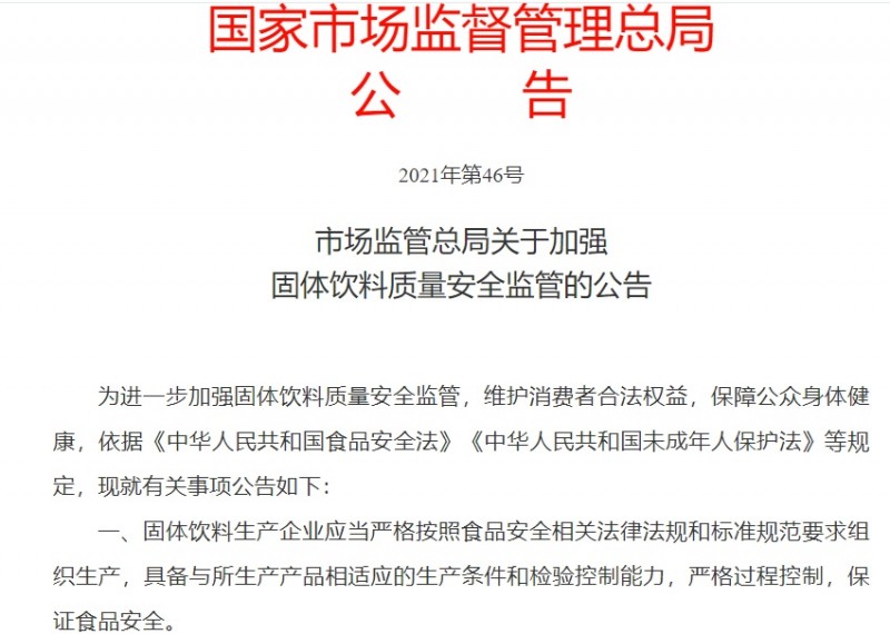 为打击保健食品行业的“李鬼”,遏制非法宣传,引导消费者科学选购食品和保健食品,保护消费者健康,《市场监管总局关于加强固体饮料质量安全监管的公告》应运而生。该公告规定,固体饮料的标签、说明书等不得宣称有保健功能;为提醒消费者,固体饮料标签应标注警示语“本产品不能代替特殊医学用途配方食品、婴幼儿配方食品、保健食品等特殊食品”;固体饮料产品名称不得和已经批准的保健食品等特殊食品名称相同。