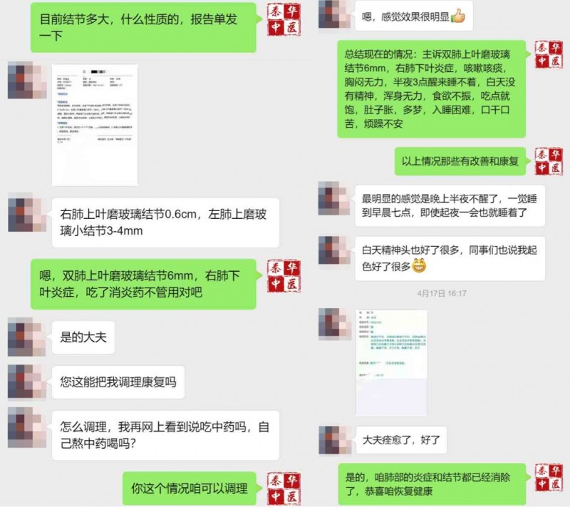 柯女士听小刘说完心中立刻燃起了希望,催促小刘马上联系朋友,小刘把从朋友那得到的医助微信推荐给柯女士,通过预约柯女士很快在西安秦华中医医院见到了贾宁主任,贾主任在认真帮柯女士把脉后,又仔细询问患者病情及生活习惯后,根据柯女士的体质调制了对症膏方,柯女士吃了一个疗程的药,效果很明显,因为秦华医院提供邮寄膏方服务,柯女士没有来回奔波,让工作人员帮她把膏方寄回去,又吃了半个疗程的药,效果就更明显了,同事们都说精神头好了很多,半夜不醒了,一觉睡到自然醒,痰少了,胃口好了,胸闷减轻了,把一个疗程的药吃完,柯女士去检查肺结节消除痊愈了,恭喜柯女士恢复健康。