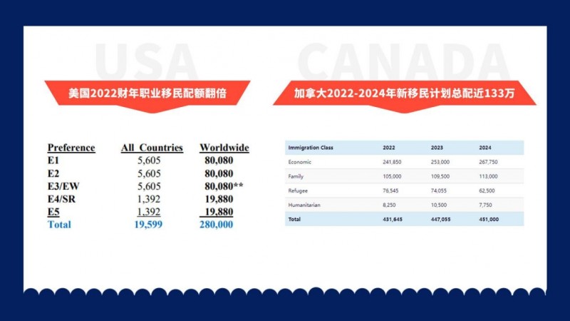 我们以美国、加拿大为例,由于蔓延全球的这场新冠病毒疫情,从2020年开始已经整整两年,给世界各国都造成了巨大伤害,美国加拿大也不例外,对于美国和加拿大国内来说,各行业的劳工短缺问题是尤为严重的,所以为了解决劳动力短缺问题,美加两国纷纷选择直接从移民引进计划方面进行了大力调整,其中美国创纪录的将2022财年人才类移民项目增加14万配额,加拿大也是制定了一个3年近133万新移民的庞大计划。