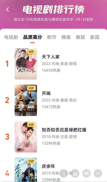 要说春节之后最火的热播剧,《天下人家》肯定榜上有名。该剧由著名导演高希希执导,于和伟、杨童舒、李依晓、潘虹、李明启、刘涛、洪剑涛一众实力演员领衔出演,自腾讯视频、爱奇艺和优酷上映以来,全网好评不断,3月1日更是荣登腾讯视频电视剧榜品质高分类第一名,豆瓣评分在3月份也是高达8.1,这些无疑都是对导演及演员实力的肯定,大家被剧中人物冲突所吸引,也为他们的善良和包容感动,堪称今年的温情催泪大剧,深入人心!