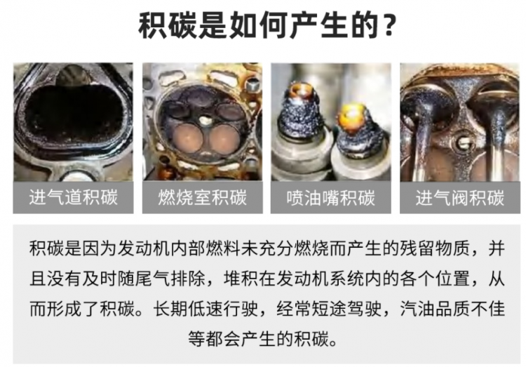 在车辆的使用过程中,也可能会伴随着沉积物聚集。汽车积碳的产生是因为发动机内部未充分燃烧而产生的残留物质,并且没有及时随尾气排除,堆积在发动机系统内的各个位置,从而形成了积碳。长期低速行驶,经常短途驾驶,汽油品质不佳都会产生积碳。