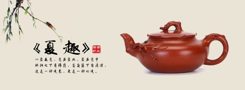 壶口、壶盖整体处理为粗枝干葡萄藤的一段,必须采用的嵌盖处理对技艺要求极高,更何况用料是烧制收缩比极大的赵庄朱泥。壶盖与壶身点缀两只小虫,有栩栩如生徜徉自如之态,凭添几许意趣,整壶营造出了恬淡俊朗、意趣横生的氛围,此为《夏趣》壶文化创意及制作技艺的独到之处,意在壶外,壶在意中,意趣橫生这是一种境界更是一种心境有徜徉自如之态。