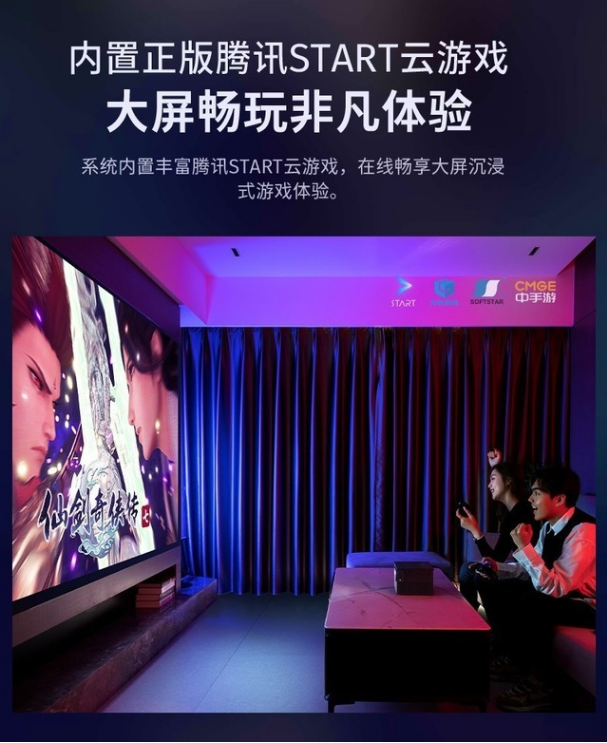 此次腾讯极光P2投影的一大亮点功能是内置了云游戏专区,开机就能玩正版的腾讯START云游戏,通过云游戏技术让更多安卓游戏玩家在投影仪和手机等设备上链接畅玩大型游戏。HDMI游戏低延迟模式,让您在使用大屏玩游戏的同时不用担心游戏延迟造成的体验影响,玩起来更畅快,4+64GB的超大内存,也保证了使用的流畅度。
