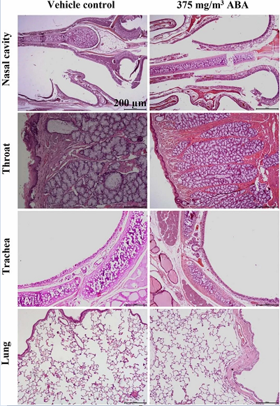 急性吸入毒理评估结果显示,雌性大鼠吸入283 mg/kg和雄性大鼠吸入276 mg/kg的槟榔碱盐后,未见临床指标异常。28天吸入毒理评估结果表明,与溶剂对照组相比,大鼠以口鼻暴露方式吸入2510 mg/m?槟榔碱盐雾化液其体重、摄食量、血液学、血生化、脏器重量、脏器系数和组织病理学指标均无显著性变化。以上实验均参考OECD准则(国际经济合作与发展组织化学品测试准则)开展,首次系统科学的评估和证实了槟榔碱盐在测试剂量条件下的雾化吸入安全性。