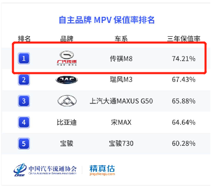 也正因为广汽传祺对于品控的坚持,在近期出炉的2021汽车之家保值率排行榜中,广汽M8高居中国品牌MPV排行第一,并且是唯一进入MPV总榜的国产豪华MPV。而在中国汽车流通协会和精真估联合发布的《2021年度中国汽车保值率报告》中,传祺M8以74%高保值率荣登自主品牌MPV榜单No1,与传祺GS8成为唯二保值率超70%的中国品牌。