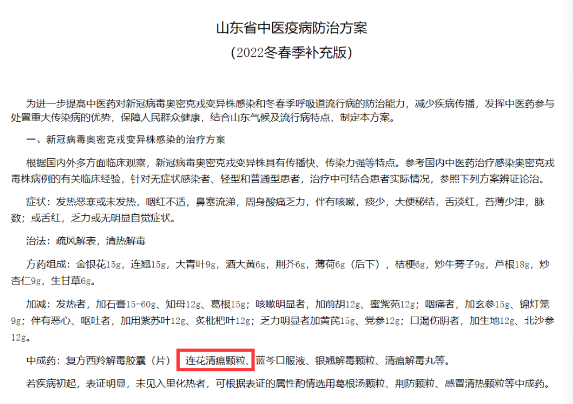 连花清瘟从2003年进入市场至今,已经获得国家层面20余次方案推荐,从甲型流感、乙型流感、禽流感到新型冠状病毒性肺炎,在这十几年我国发生的病毒传染性重大公共卫生事件中,连花清瘟都获得了治疗方案的推荐,成为治感冒、防流感、治疗新冠肺炎代表性中成药。2022年1月《山东省中医疫病防治方案(2022冬春季补充版)》中将“连花清瘟颗粒”列为新冠病毒奥密克戎变异株感染的治疗方案推荐中成药。