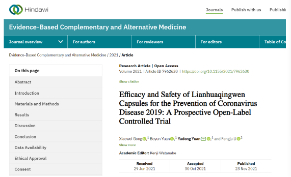 中成药连花清瘟预防新冠肺炎研究取得重要进展。近日,由中国河北医科大学第二医院呼吸与危重症医学科、武警河北总队医院医学影像科共同撰写的科研论文《连花清瘟胶囊预防新型冠状病毒肺炎的有效性和安全性研究:前瞻性开放标签对照试验》于近日在国际期刊《循证补充和替代医学》发表,揭示出连花清瘟在预防新冠感染中的作用,引发学界广泛关注。