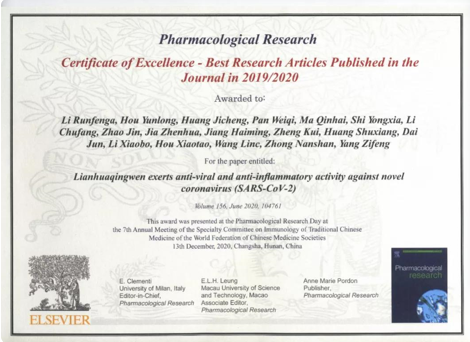 论文《连花清瘟对新型冠状病毒具有抗病毒、抗炎作用》被国际期刊《药理学研究》评选为2019-2020年度全球优秀论文奖