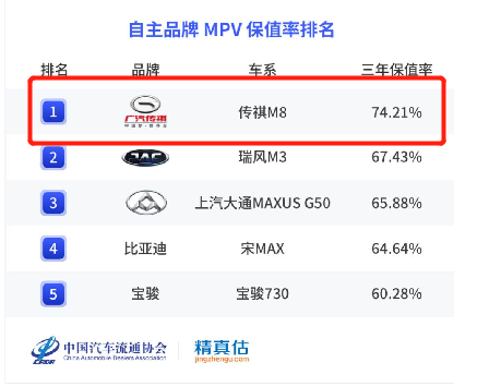 也正因为广汽传祺对于品控的坚持,在近期出炉的2021汽车之家保值率排行榜中,广汽M8高居中国品牌MPV排行第一,并且是唯一进入MPV总榜的国产豪华MPV。而在中国汽车流通协会和精真估联合发布的《2021年度中国汽车保值率报告》中,传祺M8以74%高保值率荣登自主品牌MPV榜单No1,与传祺GS8成为唯二保值率超70%的中国品牌。