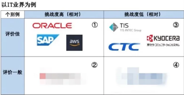 如果能够确定1-2个业界(最好有部分共通性)的话,根据业界评判、个人判断&感受、经验者交流等,相信不难选出4个梯队的企业: