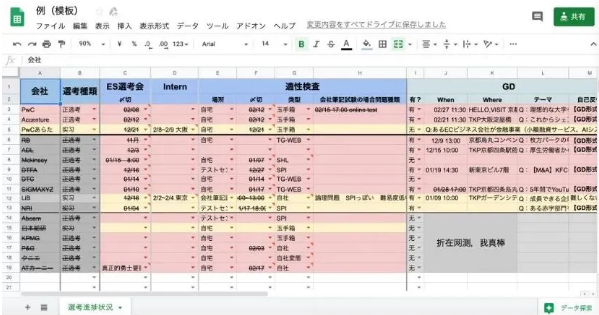 相信一些身经百战的同学们都会理解制作一份進捗表的重要度。学习生活之外加上大批企业选考,已经把每天日程填的满满当当,总会有这么几次把締切忘在脑后,丢失志望企业的选考机会;又或者遗漏掉企业一方给出的关键信息导致选考时无法发挥出真正实力等等…