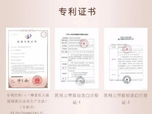 回顾胶原蛋白的发展史,我们对III型胶原蛋白的研究经历一系列复杂且困难的过程。早期的胶原蛋白主要是从动物组织中提纯而来,但从中提纯出来的胶原蛋白为异种提纯,水溶性差,不易与人体结合,皮肤涂抹容易出现排异过敏反应。而随着基因重组技术的快速发展,在经历了无数次的实验与失败之后,锦波生物联合复旦—锦波功能蛋白联合研究中心、中国科学院生物物理研究所终于解析了人III型胶原蛋白中央功能区域的高分辨率原子结构,在该领域取得了重要的原始创新突破。结合蛋白工程前沿的蛋白理性设计和优化技术,成功得到了高活性型,绝对安全的重组人源III型胶原蛋白,并取得多项专利证书。
