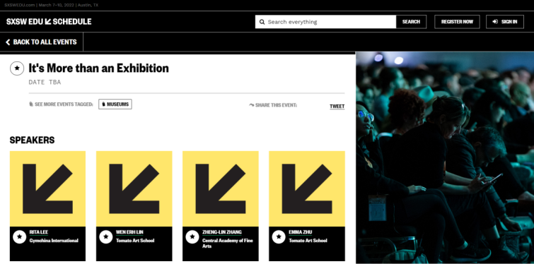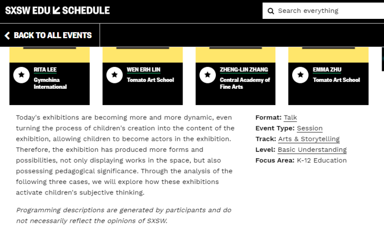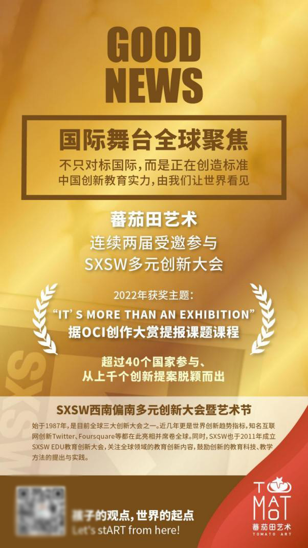 蕃茄田艺术作为亚洲区域受邀参加SXSW多元创新大会(全球三大创新大会之一)的艺术教育机构,连续两届受邀并参与大会中进行分享,为孩子的创造力与艺术力在国际上发声。据OCI创作大赏提报课题课程“It's more than an exhibition”获得2022年SXSW颁奖,荣幸列入Art&Storytelling部分于官网进行分享。