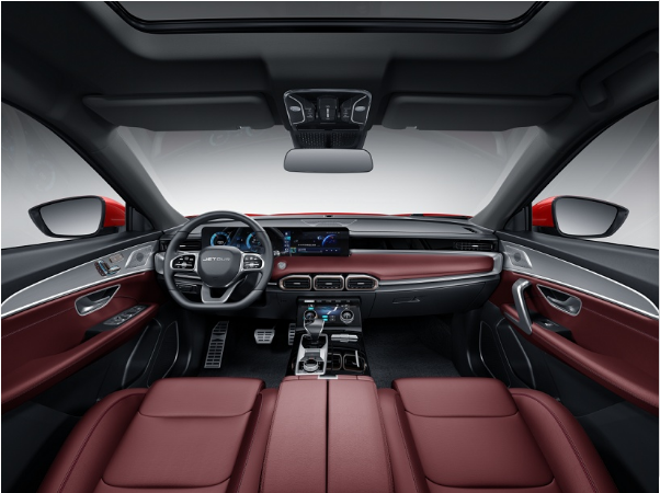 捷途X70 PLUS的内饰设计干净整齐,从门板上的座椅调整按钮、双10.25英寸的大连屏、软性皮革包裹及配色上,均能感受到捷途X70 PLUS的内饰很高档并且科技感十足。