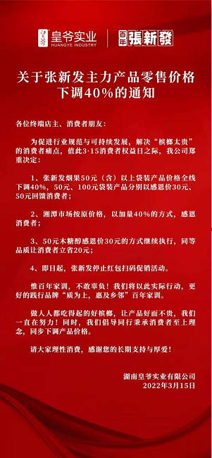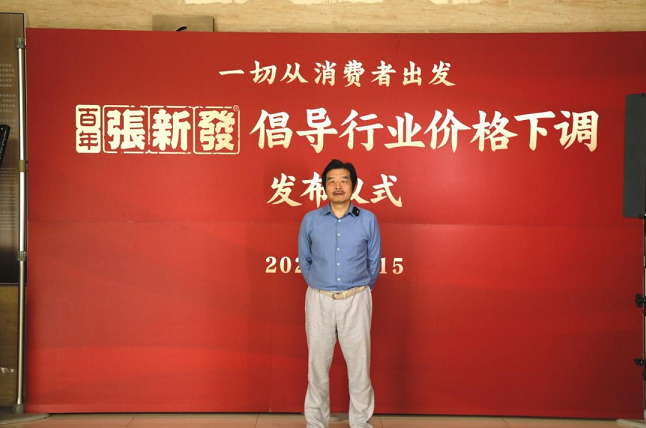 3月15日,张新发第四代传人张刚强发布了产品调价的决策,随后公司下发了《关于张新发主力产品零售价格下调40%的通知》。